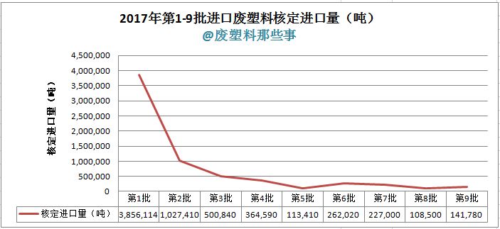 2017年4月21日,第9批廢塑料進口批文公示,這次僅有15家企業(yè)獲得了批文,核定進口量141,780噸。我們來看看環(huán)保部公示的2017年前9批所發(fā)放的廢塑料進口批文數(shù)量統(tǒng)計圖。
