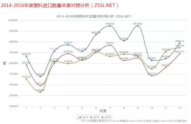 從2014年—2016年廢塑料進口數(shù)量圖中看出,2014年與2015年12月進口數(shù)量依舊呈上升趨勢,2016年12月廢塑料進口數(shù)量開始呈下降趨勢。