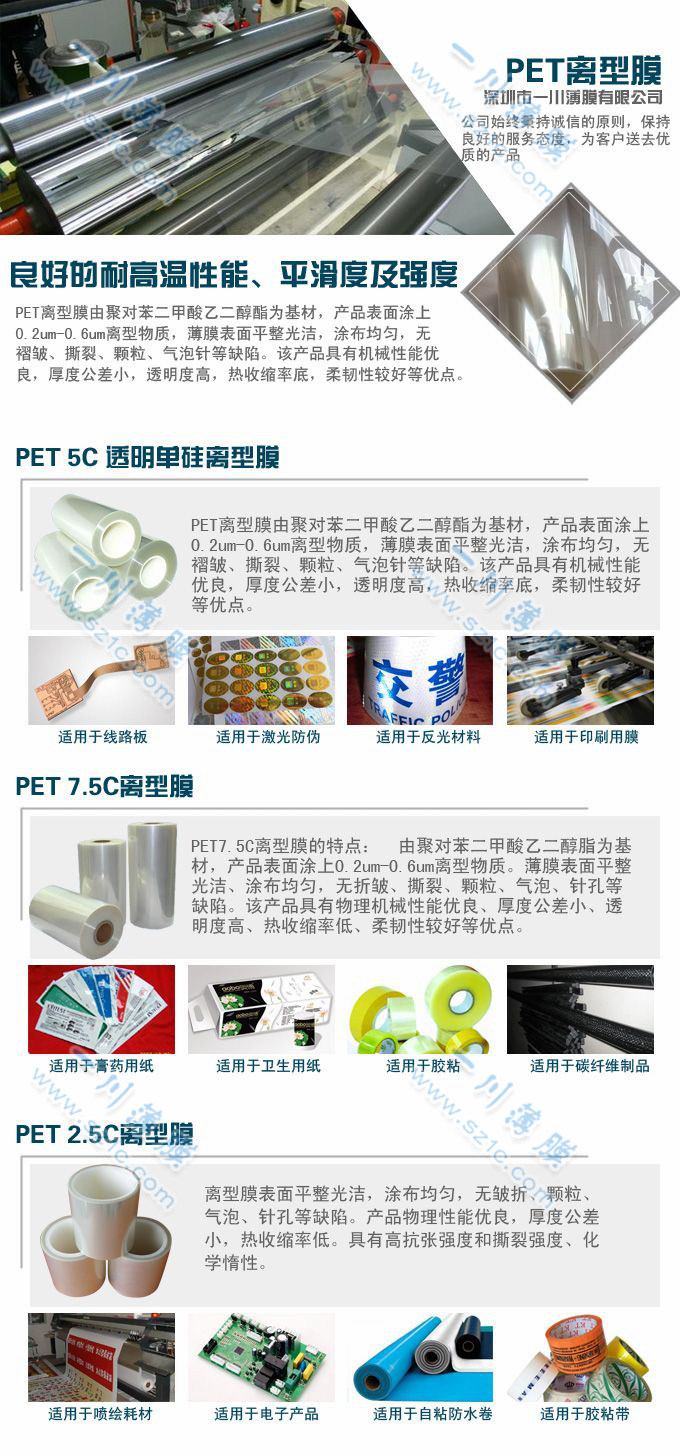 離型膜一般用來(lái)隔離粘性材料,廣泛應(yīng)用于電子、噴繪耗材,反光材料,膠帶,自粘防水卷材等行業(yè)。