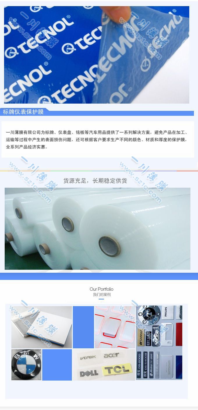 一川薄膜有限公司為標(biāo)牌、儀表盤、銘板等汽車用品提供了一系列解決方案,避免產(chǎn)品在加工、運(yùn)輸?shù)冗^程中產(chǎn)生的表面損傷問題,還可根據(jù)客戶要求生產(chǎn)不同的顏色、材質(zhì)和厚度的保護(hù)膜,全系列產(chǎn)品經(jīng)濟(jì)實(shí)惠。
